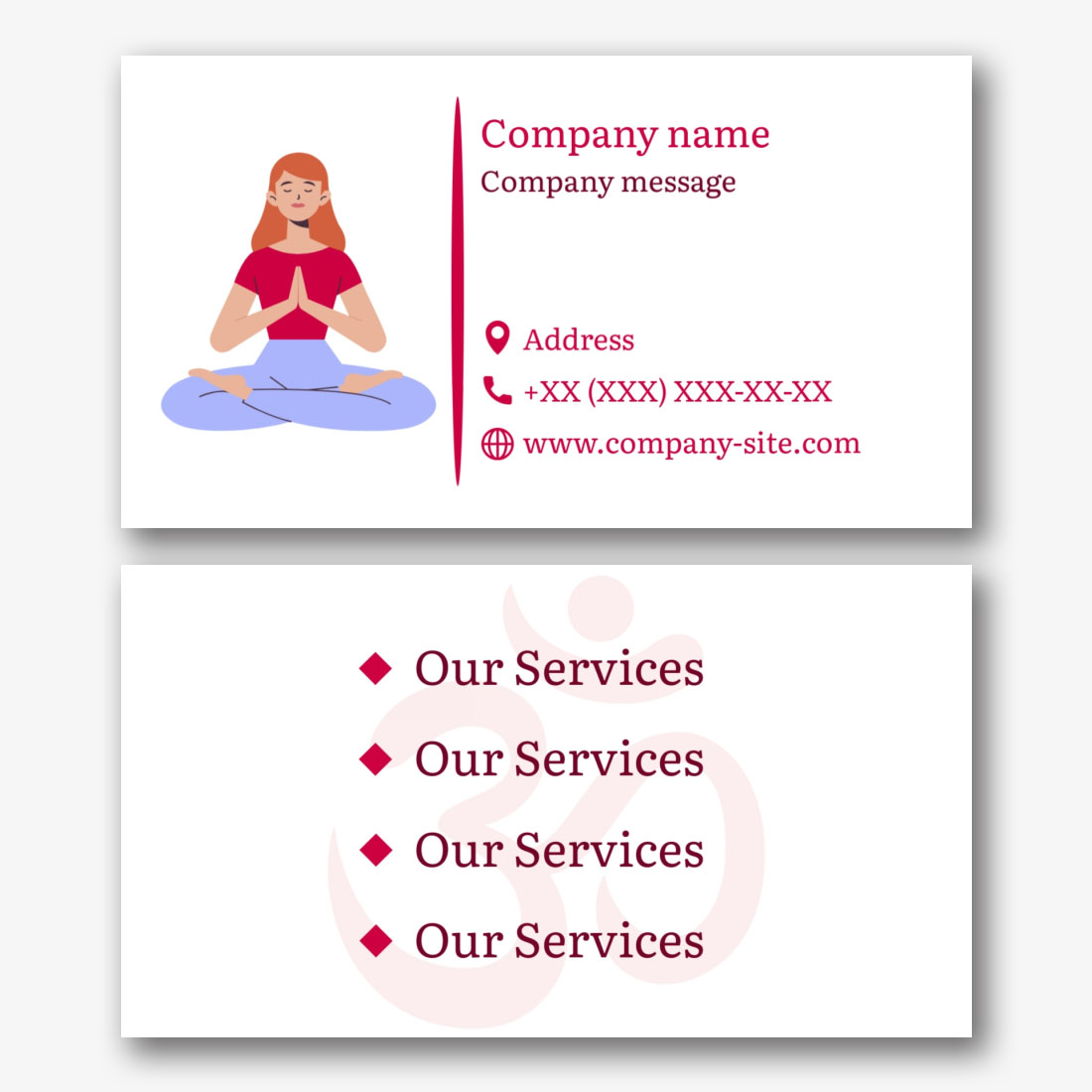 Free business card template for yoga teacher, yoga studio and meditation. Create a layout with your own hands in the business card designer.
