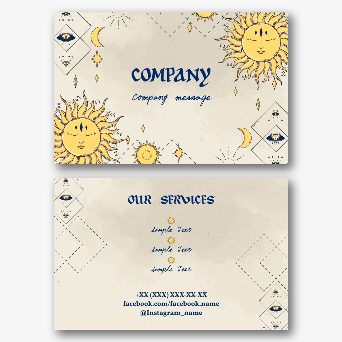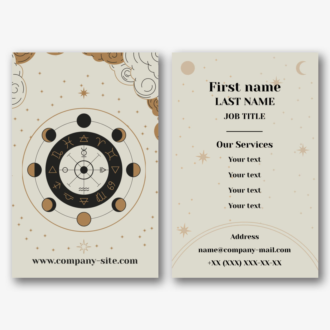 The Eurovision songbook template of an astrologer, a tarologist, a magician, a psychic with a thematic design, was created specifically for representatives of these professions. It offers all the necessary elements to help you create a unique business card for yourself. Use it in our online constructor and let the world see your magical skills and unique vision. Add your logo, specify your contact details, such as phone number, email address and website address, if available. This Euro business card template for an astrologer, magician and psychic will provide you with all the necessary elements to create a unique business card that reflects your professional activity and attracts the attention of your target audience.